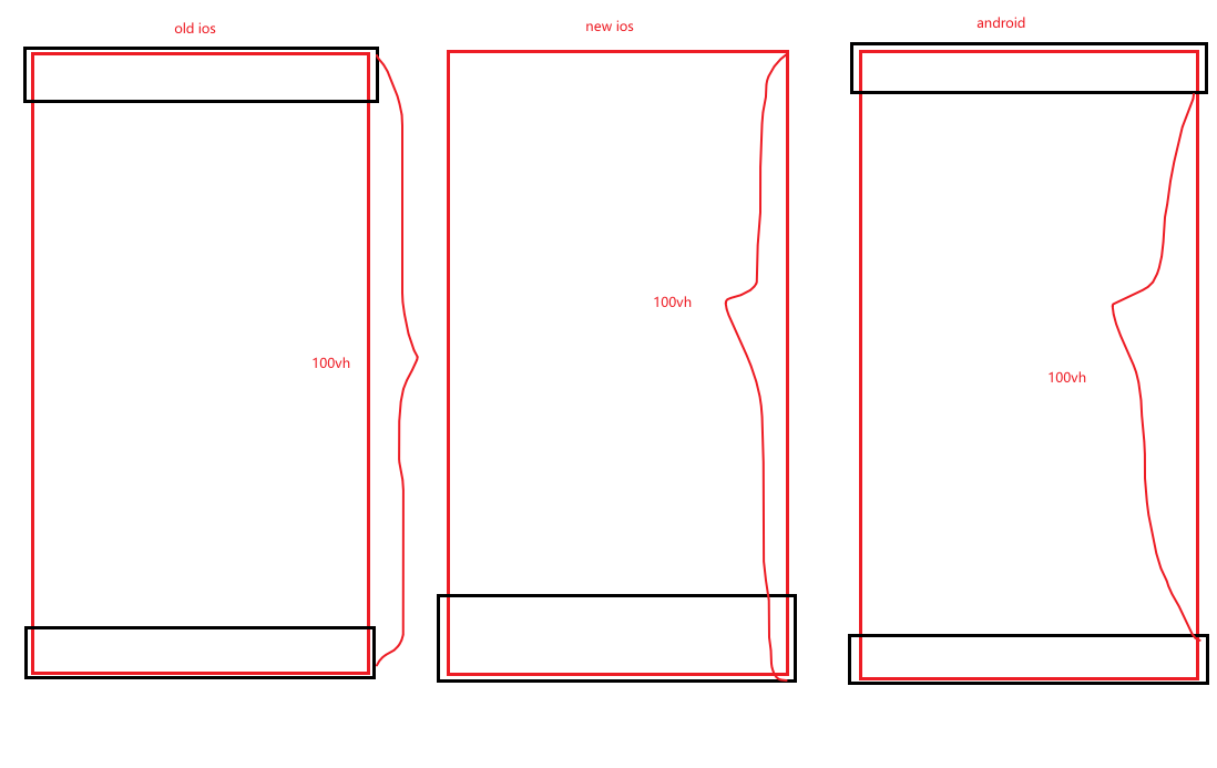 不管是新的还是就的 ios,它们的 safari 浏览器的屏幕高度(screen height)都是包括了工具栏和地址栏的。就是图中括起来的部分,可以看到网页会被地址栏工具栏遮挡掉一部分,而且上下滑动也无法解决。而安卓的屏幕高度并不会包括工具栏地址栏。